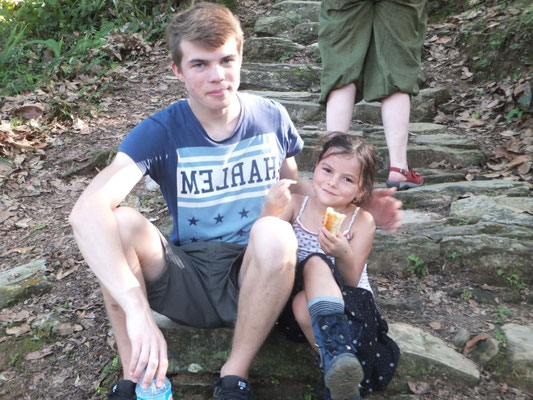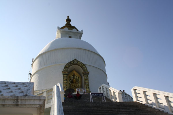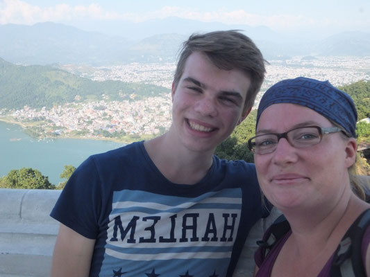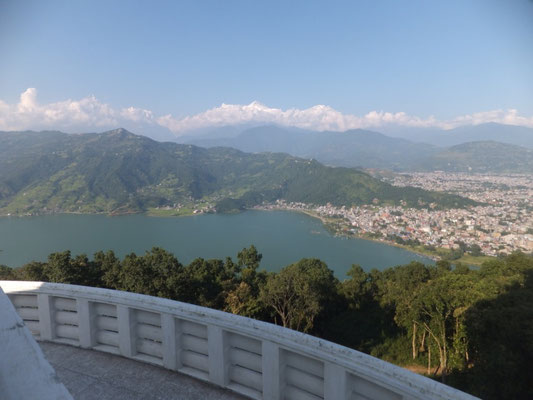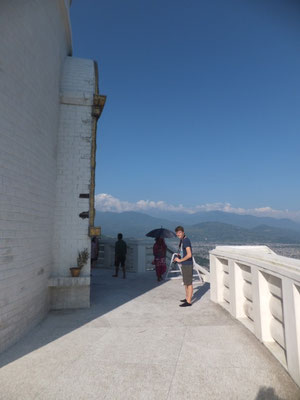 Am nächsten Tag wollten wir ein wenig die Gegend erkunden und wir haben uns auf den Weg zur World Peace Stupa gemacht, die auf der anderen Seite des Phewa Sees liegt. Wir haben uns – zu Miriams großer Freude – mit einem Ruderboot übersetzen lassen und haben uns an den Aufstieg gemacht. Und natürlich ging es wieder über Treppen hoch. Der Muskelkater vom letzten Treppenalbtraum war kaum abgeklungen, da wurde er auch schon wieder aufgefrischt… Miriam ist aber wieder wie ein Blitz hochgeflitzt und wir haben sogar eine andere Gruppe überholt.